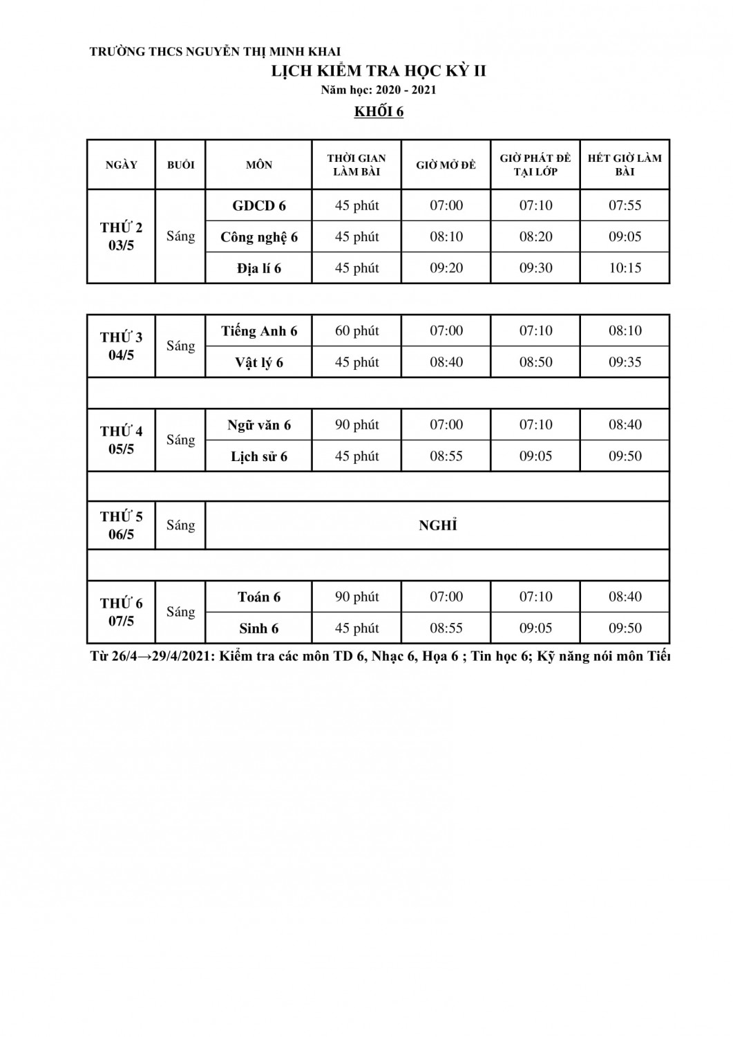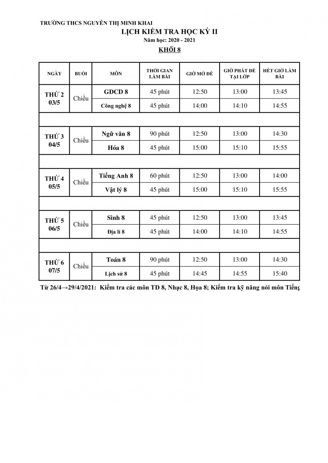 Lịch kiểm tra học kỳ 2 khối 6, 7, 8 năm học 2020 - 2021