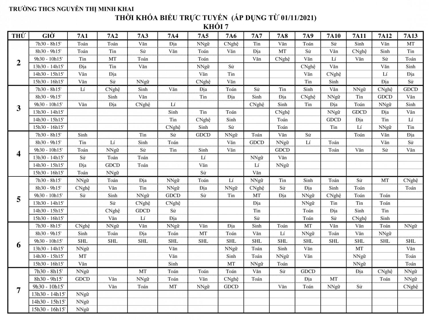 Thời khóa biểu khối 7 (Áp dụng từ 01/11/2021)