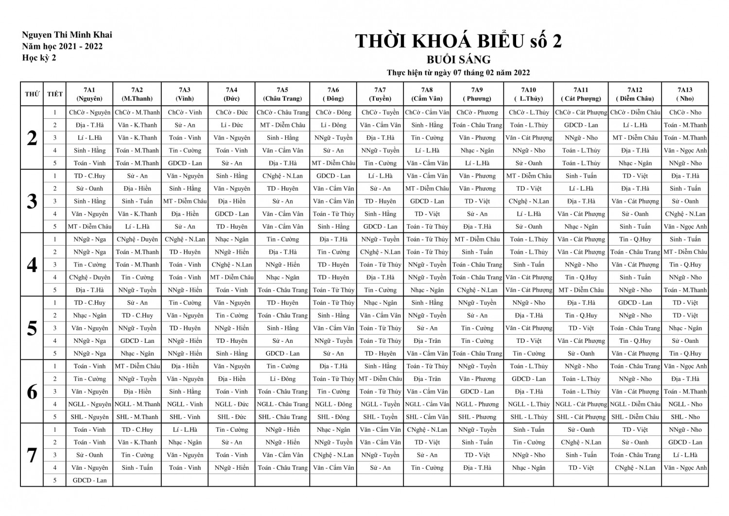 Thời khóa biểu khối 7 (Áp dụng từ 07/02/2022)