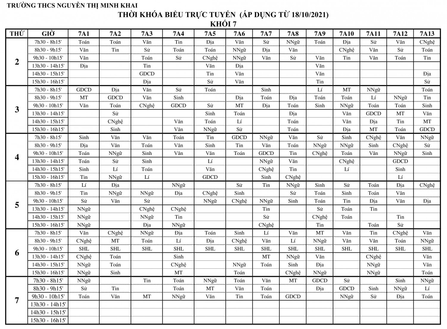 Thời khóa biểu khối 7 (Áp dụng từ 18/10/2021)