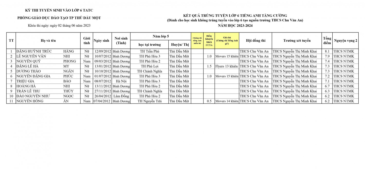 Thông báo danh sách học sinh tạo nguồn THCS Chu Văn An trúng tuyển lớp 6 Tiếng anh tăng cường
