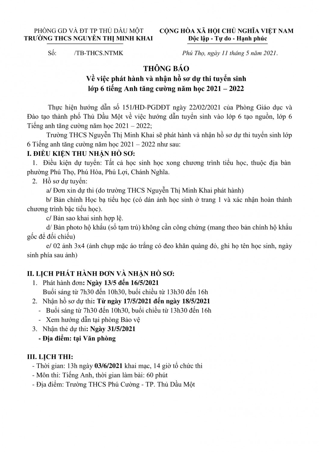 Thông báo tuyển sinh vào lớp 6 năm học 2021 - 2022 đợt 1