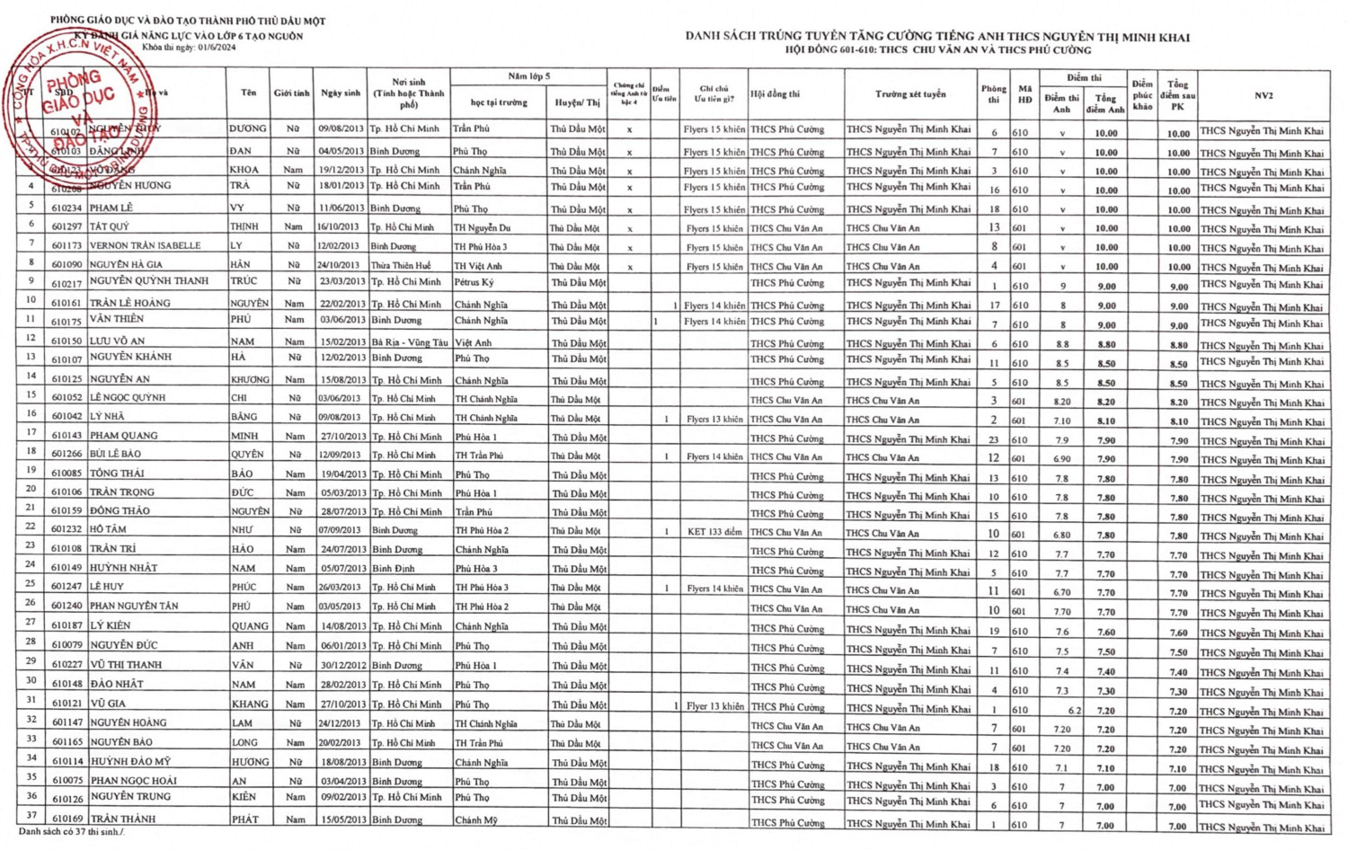 Danh sách trúng tuyển lớp 6 Tiếng Anh tăng cường năm học 2024 - 2025